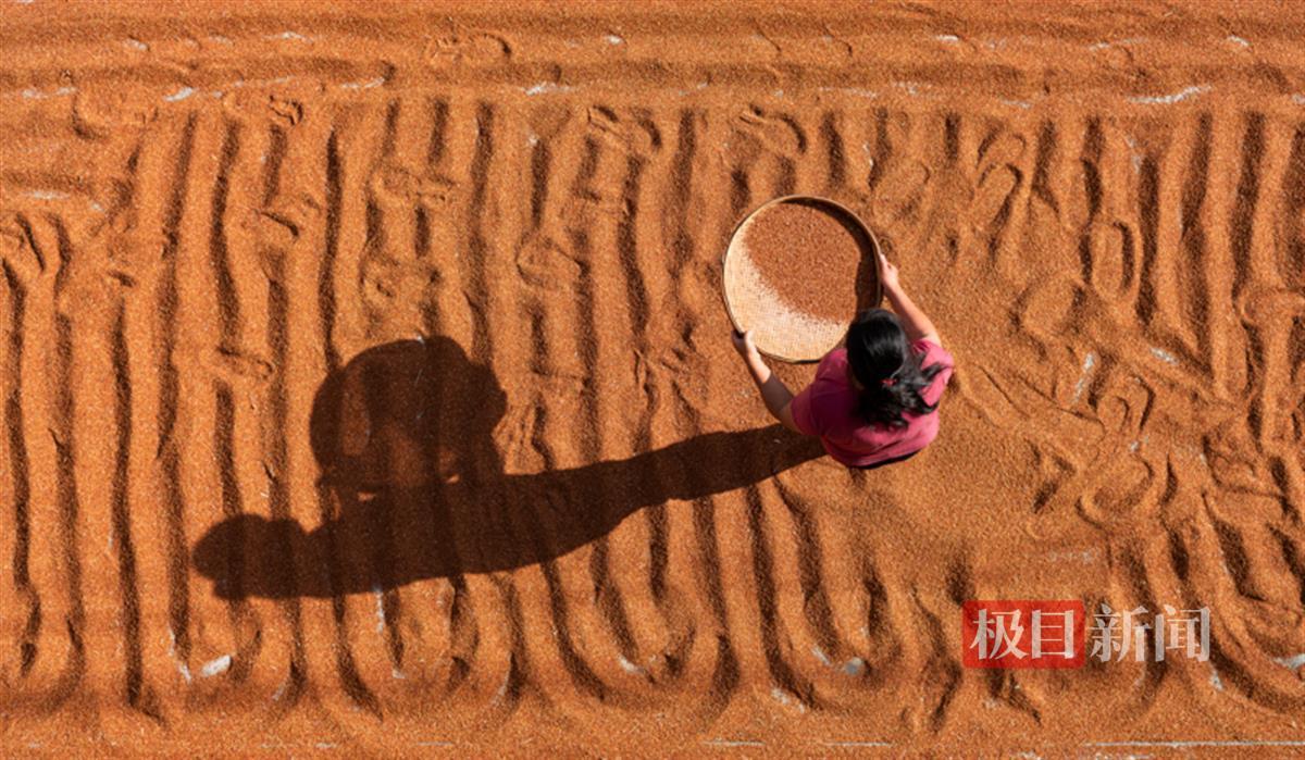 为了让晾晒更加充分,农户丁大姐有时如赤脚“踏浪”般,在高粱粒上蛇形趟动,有时操着齿耙来回翻搅,有时拿着竹编簸箕颠晃过筛,虽然忙碌却笑意盈盈。而资深的高粱农户,不少已练就了“梭手干湿、口咬听声、眼观饱圆”的特技。