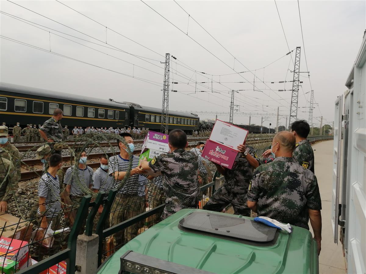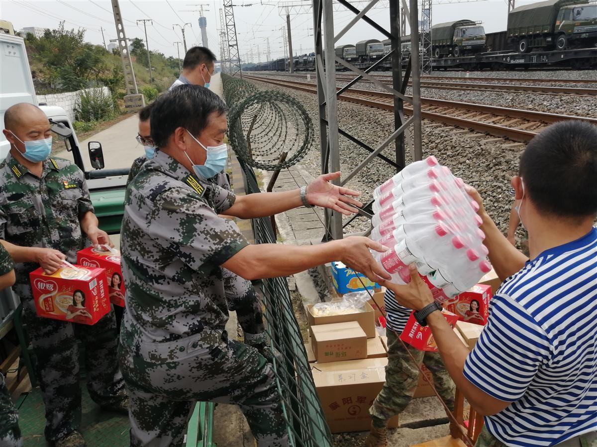站在电三轮上,为了便于传递物资,保障人员在铁路部门许可下拆除院墙栅栏上方的铁丝网。没有携带拆除工具,就动手直接上,有些同志的手被划破了,鲜血直流……可他们不管不顾,快速打通了一条两三米长的“保障通道”。保障人员将物资由卡车传到电三轮,由电三轮传给站内官兵,一箱箱、一件件……一卡车的热饭热菜、方便食品、矿泉水等物资,就这样传递过院墙栅栏,交到部队官兵手中。运送期间,还有三趟客车和一列货车沿着铁轨以八九十公里的时速呼啸而过,每每此时,负责观察安全的人员总是提前大声疾呼,让正在搬运物资的部队官兵停止搬运,躲避列车……