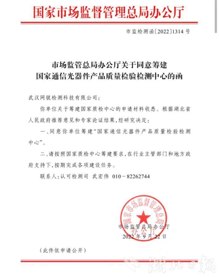 湖北日报讯(记者汪子轶、通讯员雷慧、郭姗姗)9月27日从湖北省市场监管局获悉,国家市场监管总局正式批准在湖北武汉筹建国家通信光器件产品质量检验检测中心,该国家级检测中心落地湖北,将进一步强化湖北光电子产业系统优势,助力湖北万亿级光电子信息产业集群建设。