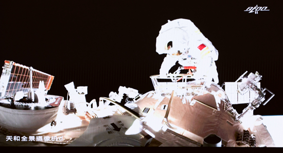 北京时间2021年11月7日,王亚平身着飞天服出舱。天和全景摄像机/摄