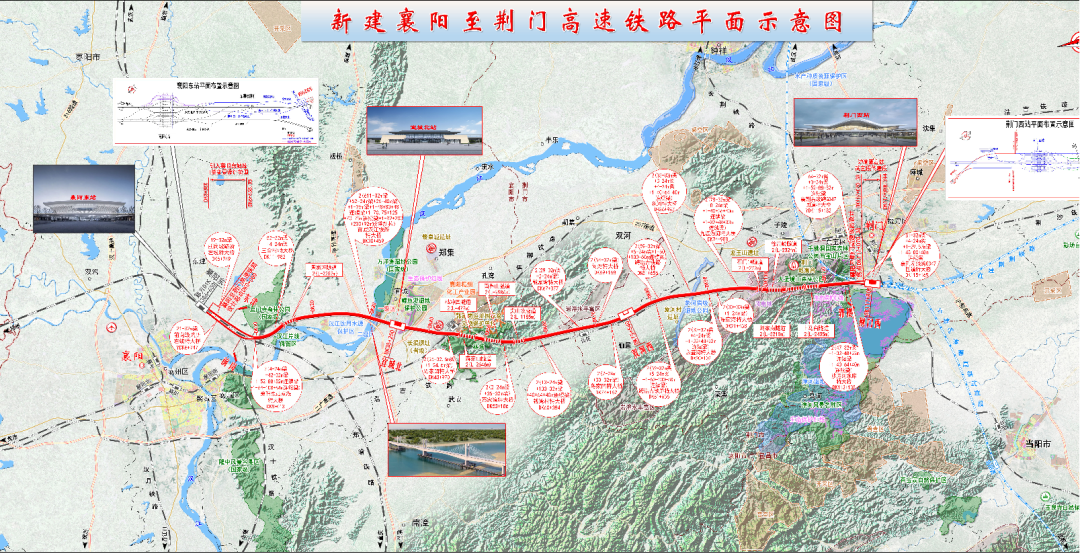本项目自襄阳东站引出,向南经宜城至沪渝蓉沿江高铁荆门西站。正线建筑长度116.8km,估算总投资197.44亿元,设计速度350km/h,建设工期3.5年。新建桥梁47座74.991公里,隧道24座20.535公里,桥隧比81.78%。全线设车站4座,分别为襄阳东站(既有)、宜城北站、双河站(越行)、荆门西站。