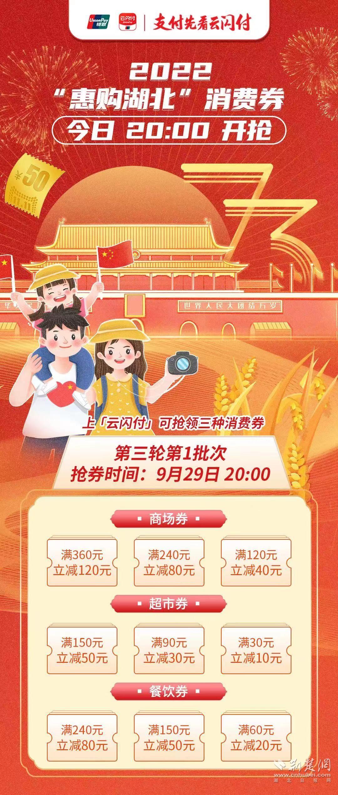 荆楚网(湖北日报网)讯(记者张扬)今晚8点,今年第三轮首批“惠购湖北”消费券将正式发放,值得一提的是,这将是抢到120元大面额消费券的最后机会。因为从10月9日发放的第三轮第二批开始,“惠购湖北”消费券将打通商场、超市、餐饮三类使用场景,改为通用券,统一设置为20元、50元、80元三种面额。