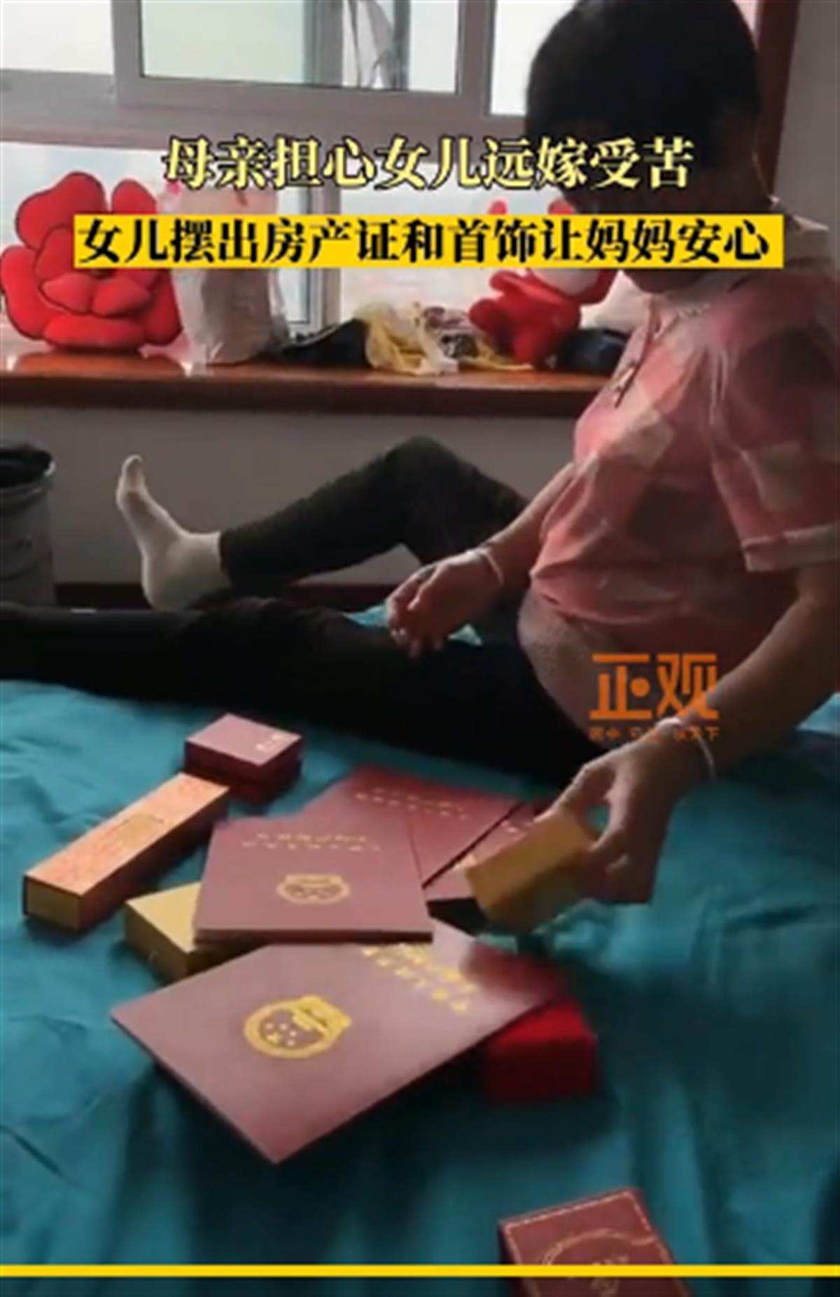 9月30日,江苏苏州。远嫁女儿摆出4本房产证和首饰让妈妈安心。女儿称, 她一直担心我过得不好。(据10月1日正观新闻)