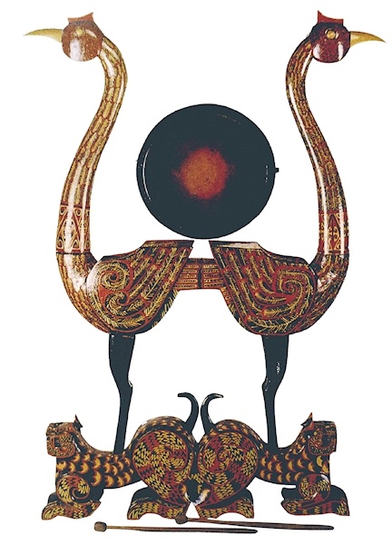读过《招魂》和《大招》两篇所描写的楚人娱鬼神招魂复魄的情景,设若我们身处钟磬笙鼓争鸣的乐声中,头脑中大概可以想象到古代楚国那样奇诡曼妙的乐舞场景。此外,以虎座鸟架鼓为代表,楚乐器多用凤鸟纹样或造型,让我们领略到楚人对凤鸟的虔诚尊崇以及随乐乘凤升天的精神世界。
