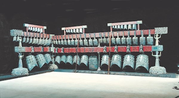 1978年在湖北随县出土的公元前433年的曾侯乙编钟及乐队,包括了“八音”中的大多数乐器,计编钟65件,其正、侧鼓部的乐律铭刻铁证了中国古代“一钟双音”的现象和理论。虽然文献早有记载,但如非亲眼所见,世人很难想象我国2400多年前乐队的组合,也很难想象青铜文化最高峰时期音乐水准的真实情况。
