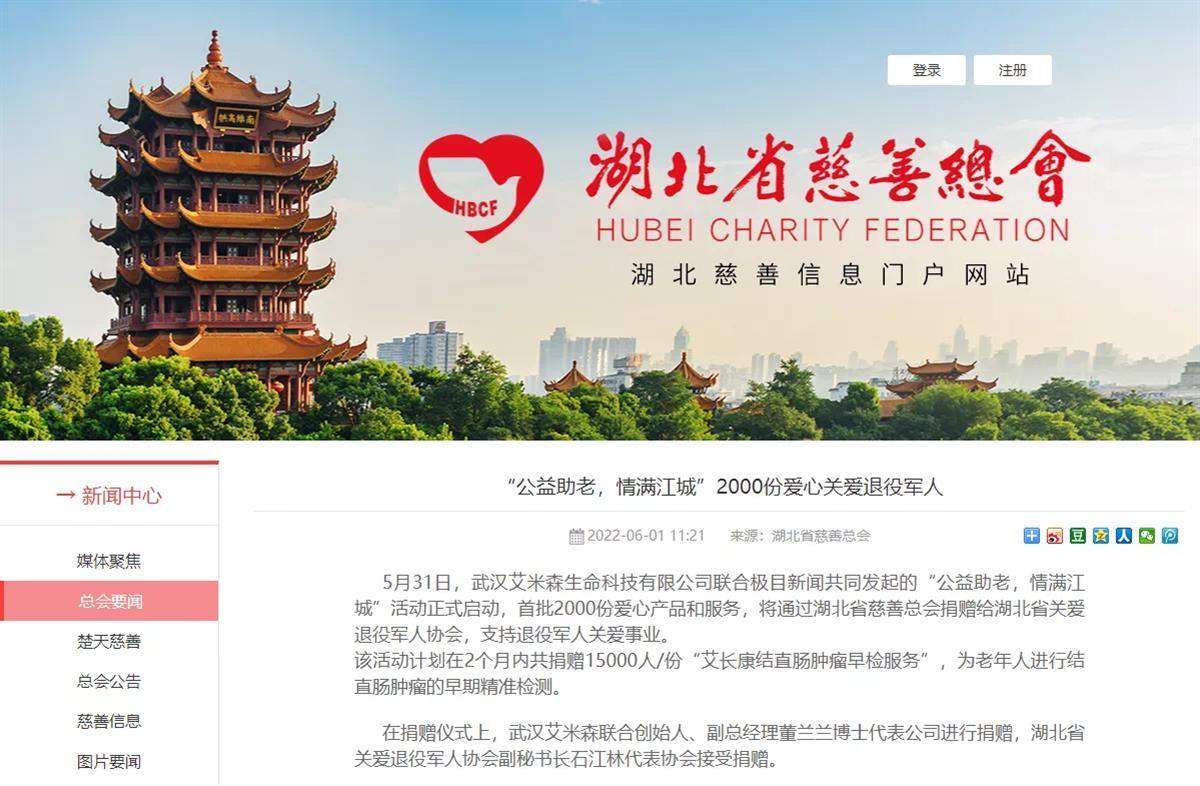 为支持湖北慈善事业,助力湖北肠癌早筛早诊工作开展,今年5月,武汉艾米森生命科技有限公司联合极目新闻发起了《公益助老,关爱“肠”在》艾长康肠癌公益检测活动,计划通过湖北省慈善总会面向全省捐赠艾长康肠癌检测产品,用于开展肠癌免费检测。