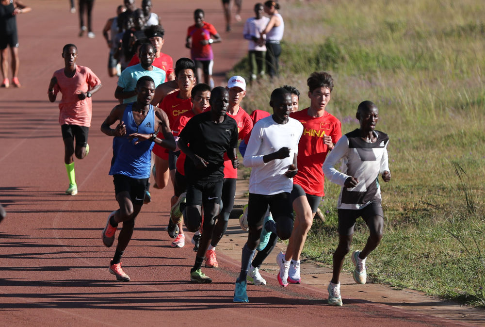 中国男子马拉松集训队队员在肯尼亚与当地运动员一起训练。新华社记者龙雷摄