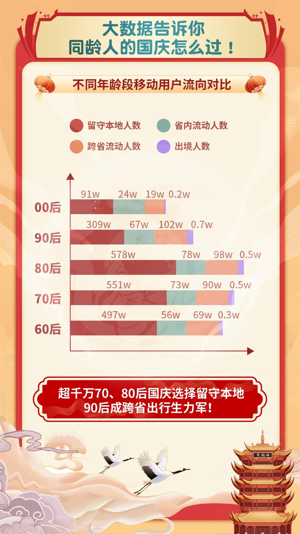 留在本地人数中,00后、90后、80后、70后、60后分别为91万、309万、578万、551万、497万。1000余万80后、70后选择假期期间留在本地。长假期间湖北省迁出人口主要集中在广东、浙江、上海、江苏、重庆等地。