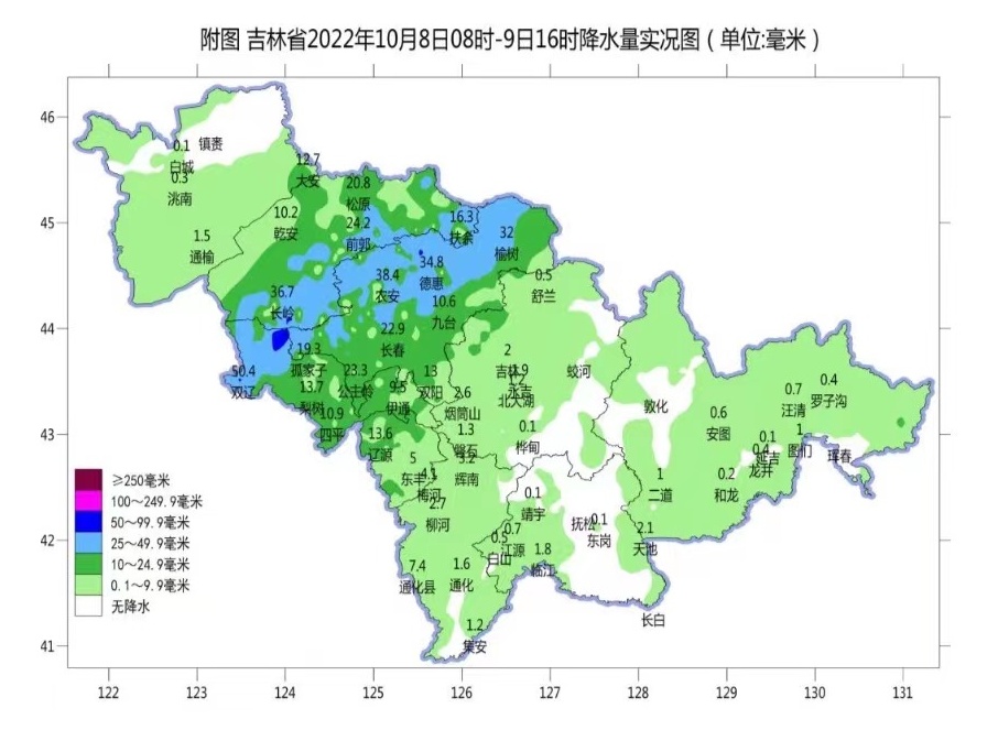 截至9日16时,吉林全省平均降水量9.3毫米,地区分布:长春21.7毫米,松原20.8毫米,四平17.2毫米,辽源10.5毫米,吉林2.9毫米,通化2.2毫米,白城1.5毫米,延边1.1毫米,其他地区不足1毫米。