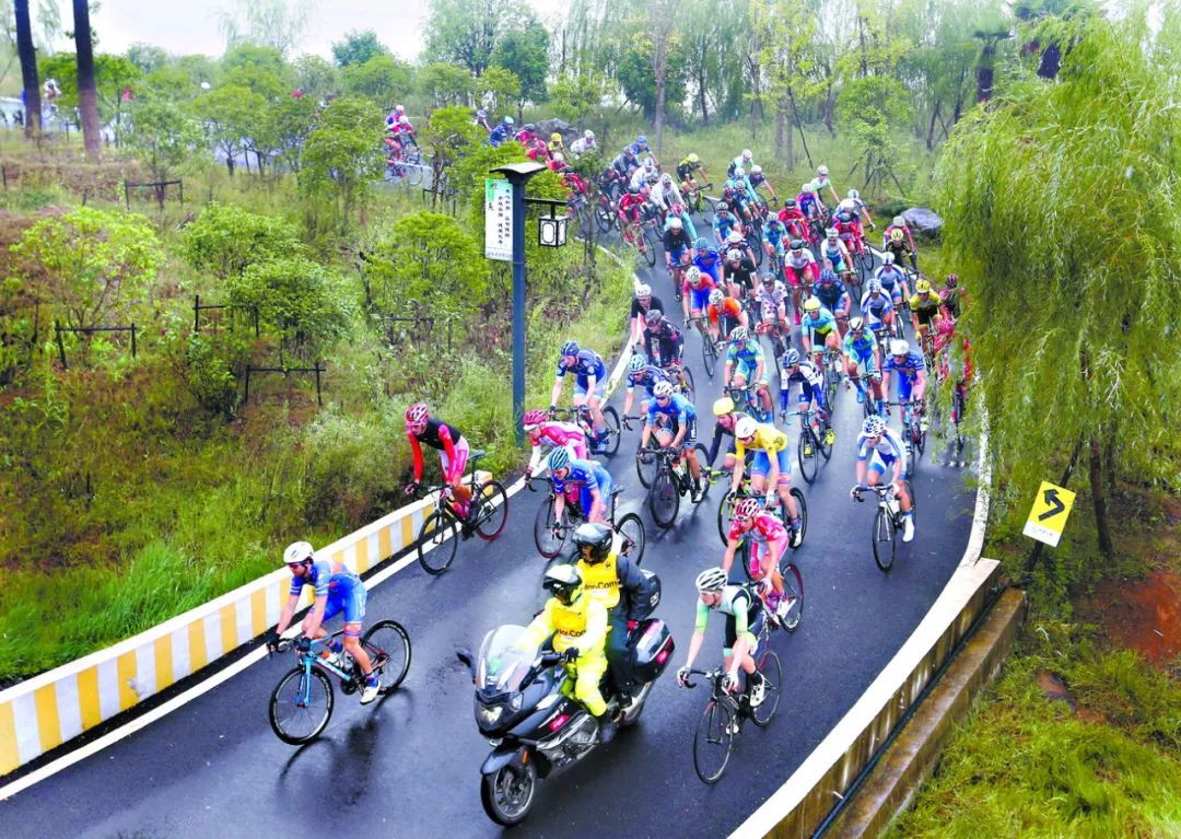2015环中国公路自行车赛武汉蔡甸段,来自32个国家和地区的200余名车手,沿着风光秀丽的后官湖极速狂飙109.2公里。记者李葳 摄