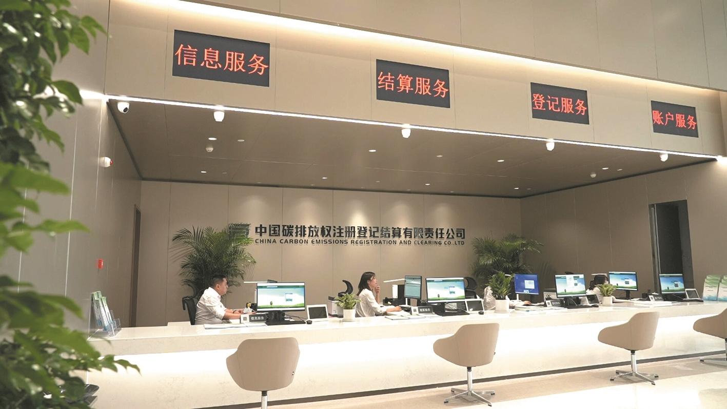 在中碳登大厦三楼全国碳排放权登记结算大厅内,一块大屏上显示着全国碳市场行情K线图,大厅设置有账户、登记、结算、信息四个柜台。