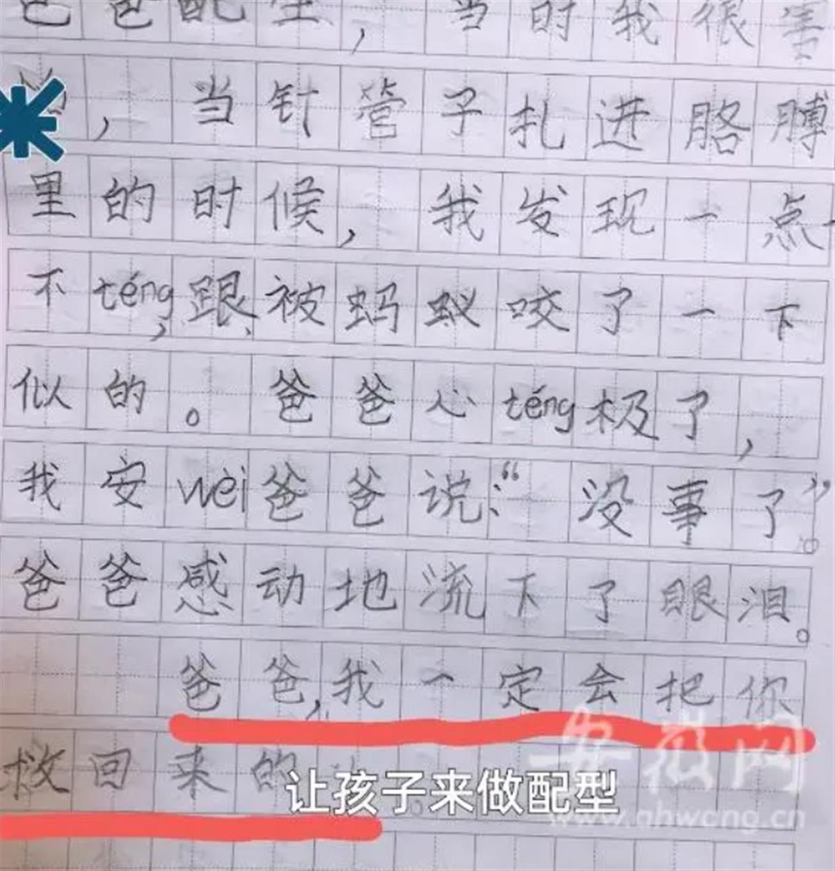 完成采血之后,儿子还在日记中记录了自己去医院配型的过程:“去医院给爸爸配型,当时我很害怕,当针管子扎进胳膊里的时候,我发现一点也不teng(疼),跟被蚂蚁咬了一下似的。爸爸心teng(疼)极了,我安wei(慰)爸爸说:‘没事了。’爸爸感动得流下了眼泪。爸爸,我一定会把你救回来的。”