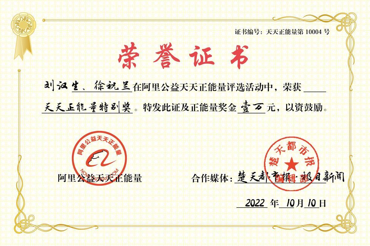 阿里公益天天正能量联合楚天都市报极目新闻在颁奖词中表示:当好心夫妻遇上残障流浪汉,14年的收留款待,造就了没有血缘却胜似亲人的羁绊。一碗热饭,一床铺盖,他们安顿下不知来处的异乡客,让这座城市里无措的灵魂不再漂泊。不顾闲言,处处尽心,夫妻俩用14年坚持,让小摊前伶仃躲闪的身影,可以靠世间的善和暖,驱散即将到来的严寒。阿里公益天天正能量联合楚天都市报为刘汉生、徐祝兰颁发正能量特别奖及奖金10000元。