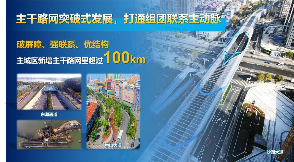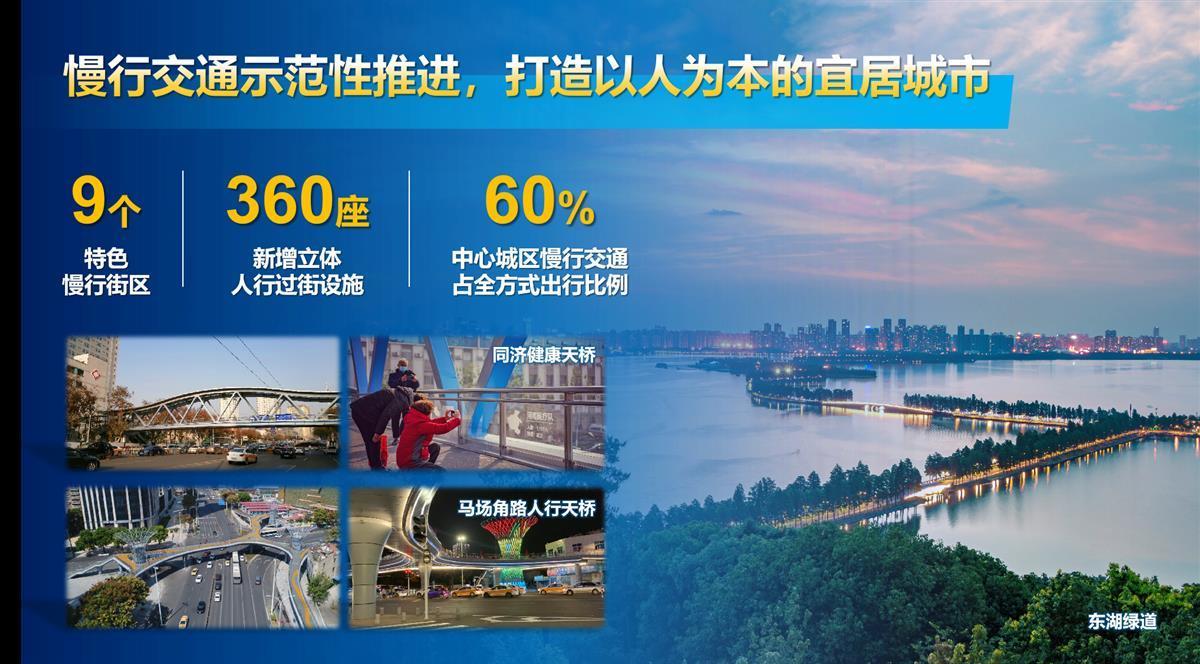 过去十年,武汉主城区新增主干路网里程超过100公里,建成多条跨湖通道、跨铁路通道、跨三环联系通道;中心城区及开发区共新建及改建807条、694公里次支路;建成了世界级的东湖绿道及九大特色慢行街区,新增立体人行过街设施360座,全市主干路网、微循环路网、慢行交通建设取得显著成效。城市品质精细化升级共完成1000多公里道路沿线环境整治提升,整治井盖17000余个,迁改箱柜400余个,集成杆件比例达到30%。