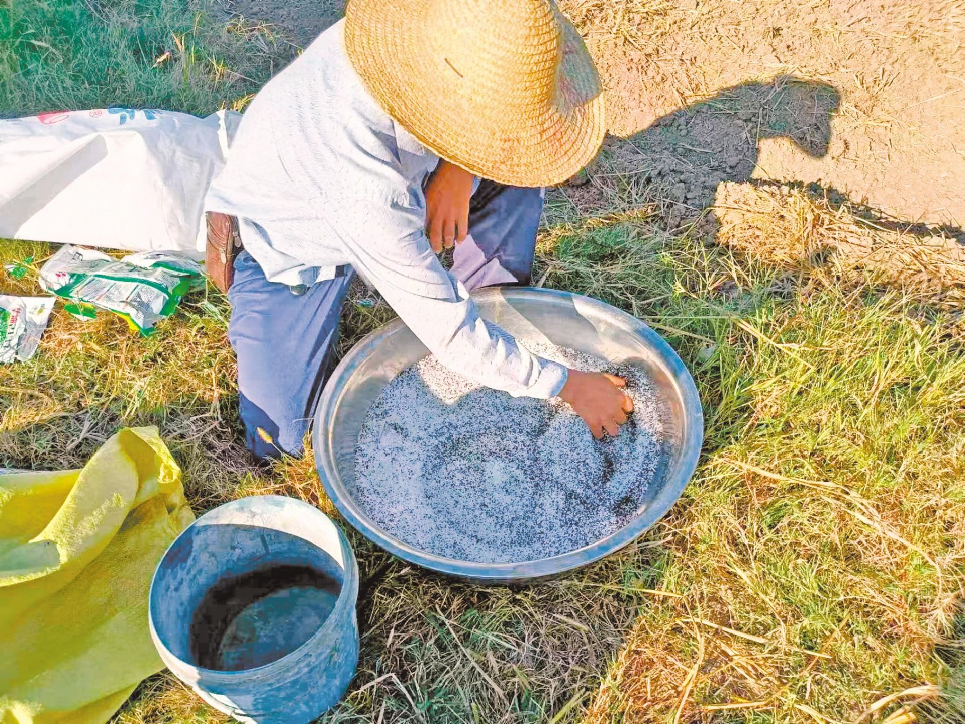 10月3日清晨,沙洋县五里铺镇显灵村“老八组”(并村后为三组一部分),刚整好的稻田里,10余农民工正在撒播“华油2133”高油酸油菜籽,“到后天下雨前,400多亩流转地油菜将全部播完。”显灵村村支书、村股份经济合作社理事长卞金平告诉记者。