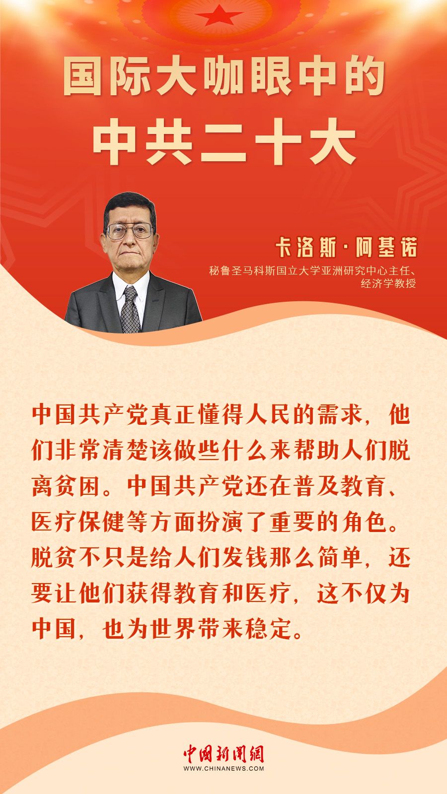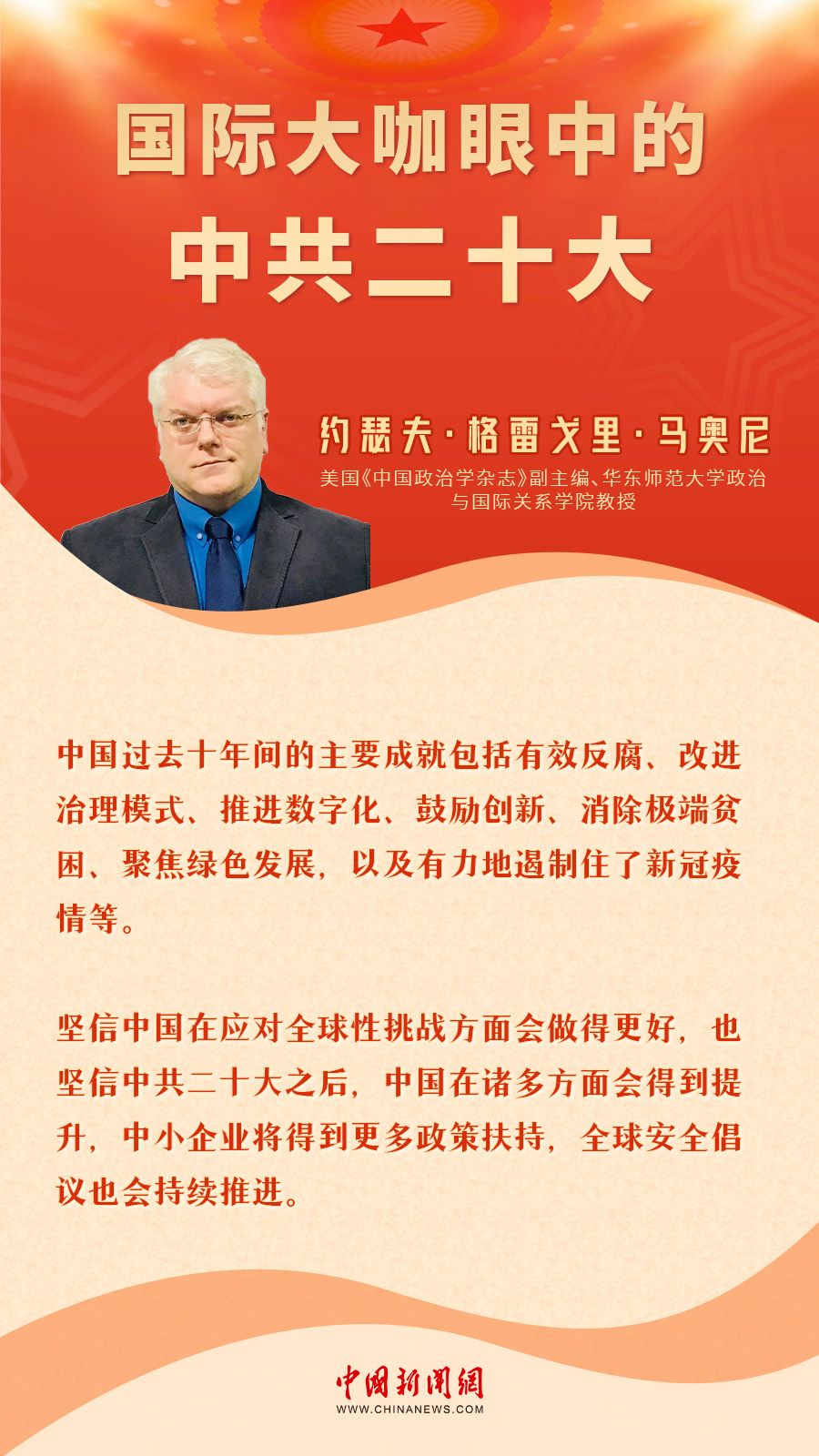 中新网北京10月15日电 如何解读中国十年发展巨变背后的制度基因?如何理解中共二十大对于中国和世界的重要意义?中国新闻网推出特别策划“国际大咖眼中的中共二十大”,以海报形式集纳各国知名人士、专家学者精彩观点,共话中国十年巨变,展望中共二十大和中国未来发展——