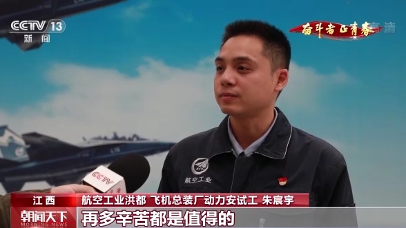 航空工业洪都 飞机总装厂动力安试工 朱宸宇:能够参加这样一项无上光荣的任务,我和我的同事们倍感自豪,其中有艰辛、有波折,任务时间紧凑,我们一直在与时间赛跑、分秒必争。当看到我们的装备顺利展现在祖国和人民面前的时候,再多的辛苦都是值得的。