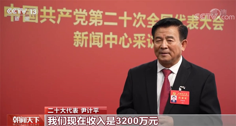 二十大代表 尹计平:我们2013年时集体收入是490万元,现在集体收入3200万元,村民收入(人均年收入)3万多元,老百姓腰包真正鼓起来了。