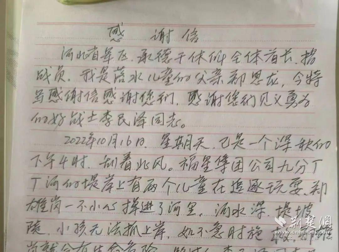 荆楚网(湖北日报网)讯(通讯员 包晓霁)10月16日,汉川市沉湖镇一名5岁小男孩在河边玩耍时,不慎掉入水中。危急关头,回乡探亲的现役军人李民泽毫不犹豫跳入冰冷的水中,将小男孩救起。