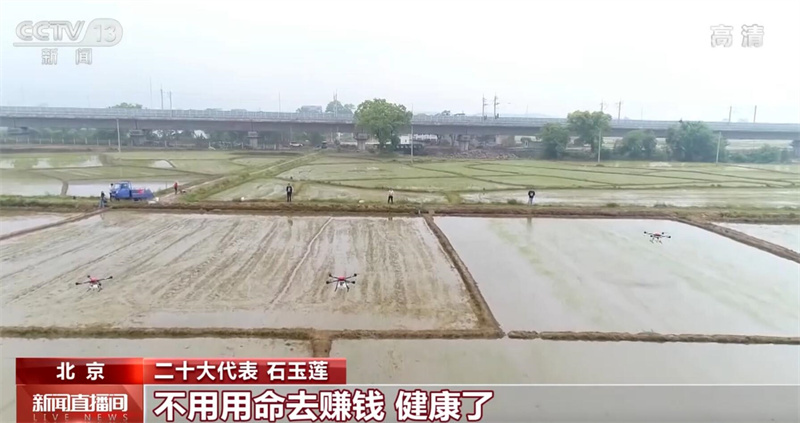 二十大代表 石玉莲:因为当时我们自己去打农药,是自己牵管子、背药水桶在田里走,打完农药之后,自己全身都是药水,等于说我们也在喝着农药。我们的农机站长就跟我说,你去用无人机吧,不用用命去赚钱,健康了。