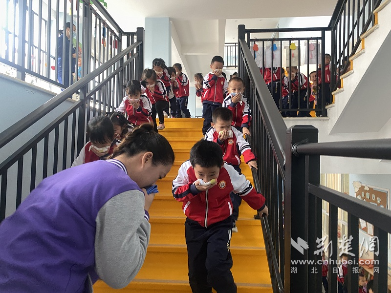 随着消防警报声的响起,各班教师迅速按消防预案的疏散路线有序带领幼儿拿起湿毛巾,捂住口鼻,弯腰小步快走,从就近安全楼梯有序下楼、快速撤离到指定安全区域。
