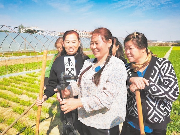 10月13日,梁咀村村民在田间地头抖音直播。(通讯员 任伟 摄)