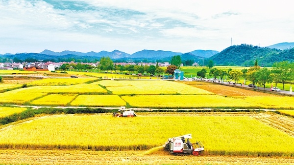 秋收时节,远安县洋坪镇三板桥村,千亩水稻成熟,满地金黄;收割机轰隆,加大马力穿梭田间,饱满的稻穗颗粒归仓。