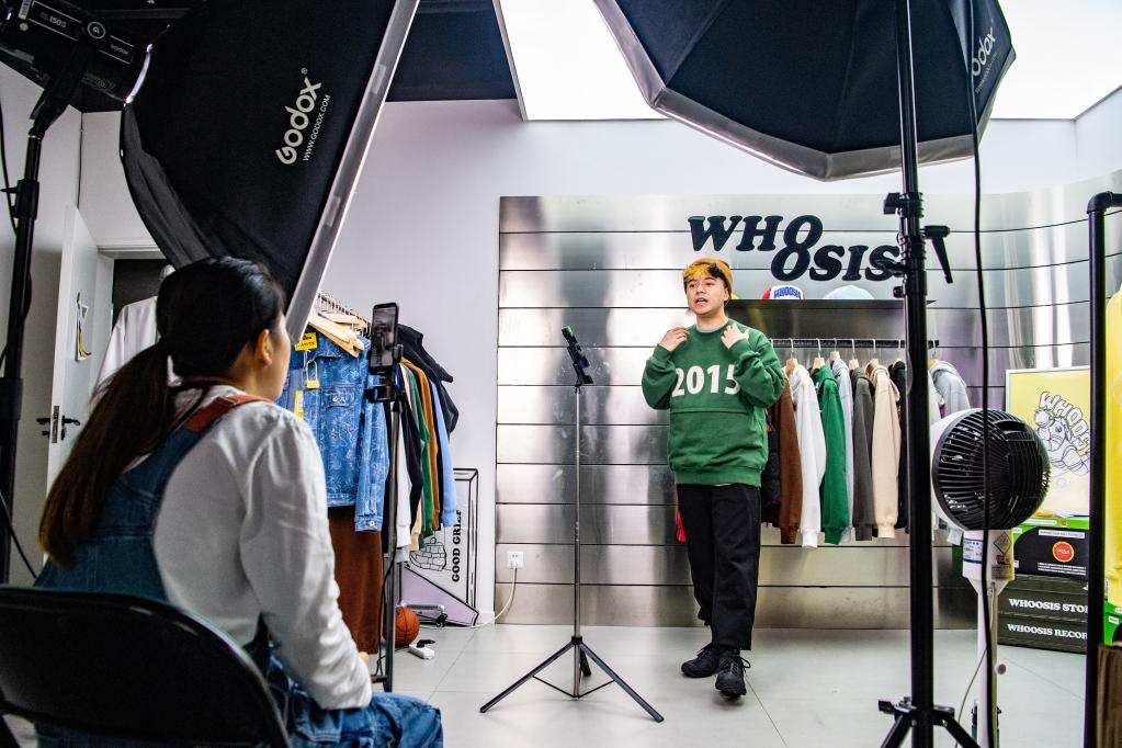 在重庆市渝中区由工业遗址改造成的“一厂影视园”一家国潮品牌公司内,创业者通过手机直播销售商品(2022年9月27日摄)。新华社记者 唐奕 摄