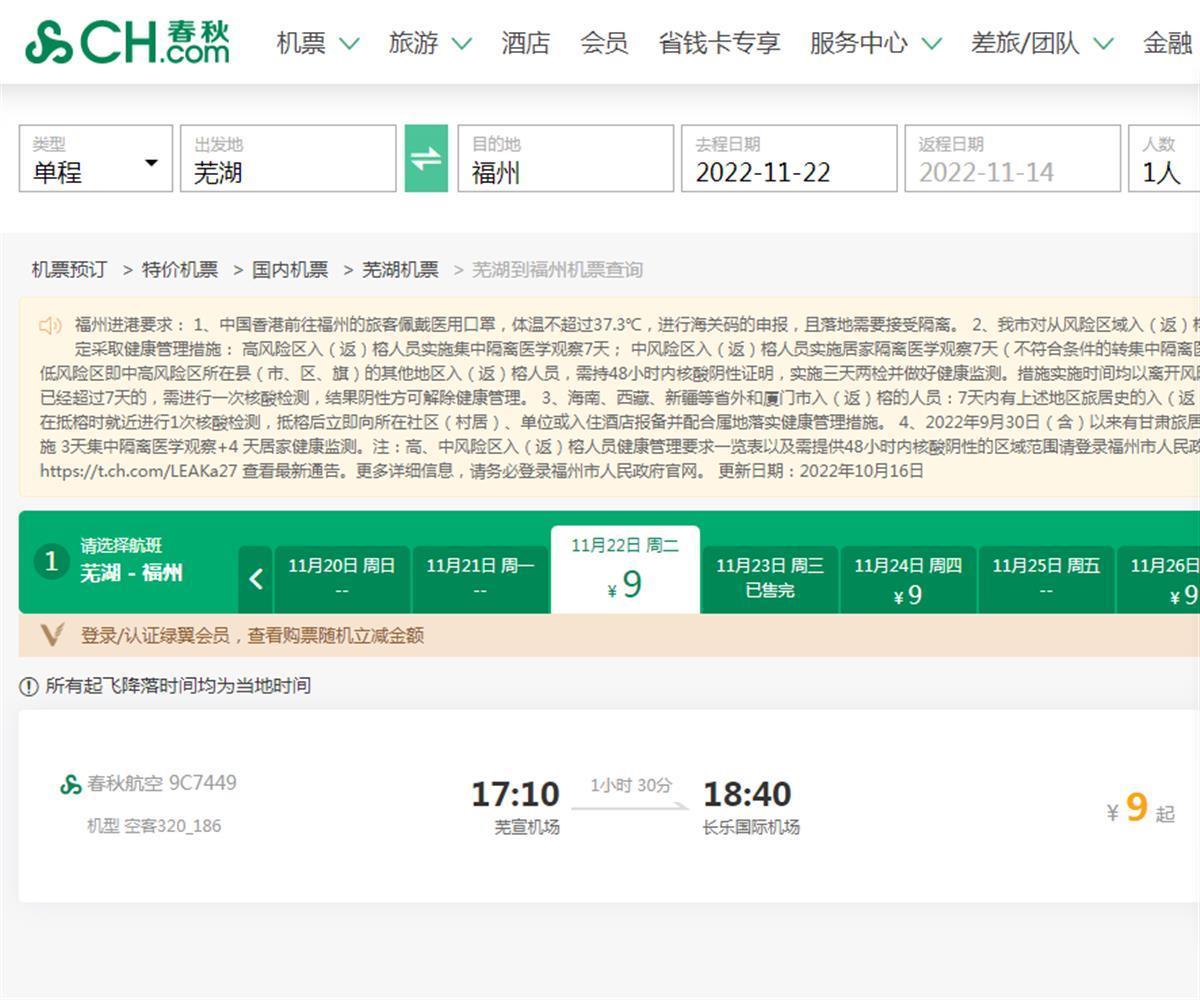 春秋航空官网上,芜湖至沈阳机票低至9元