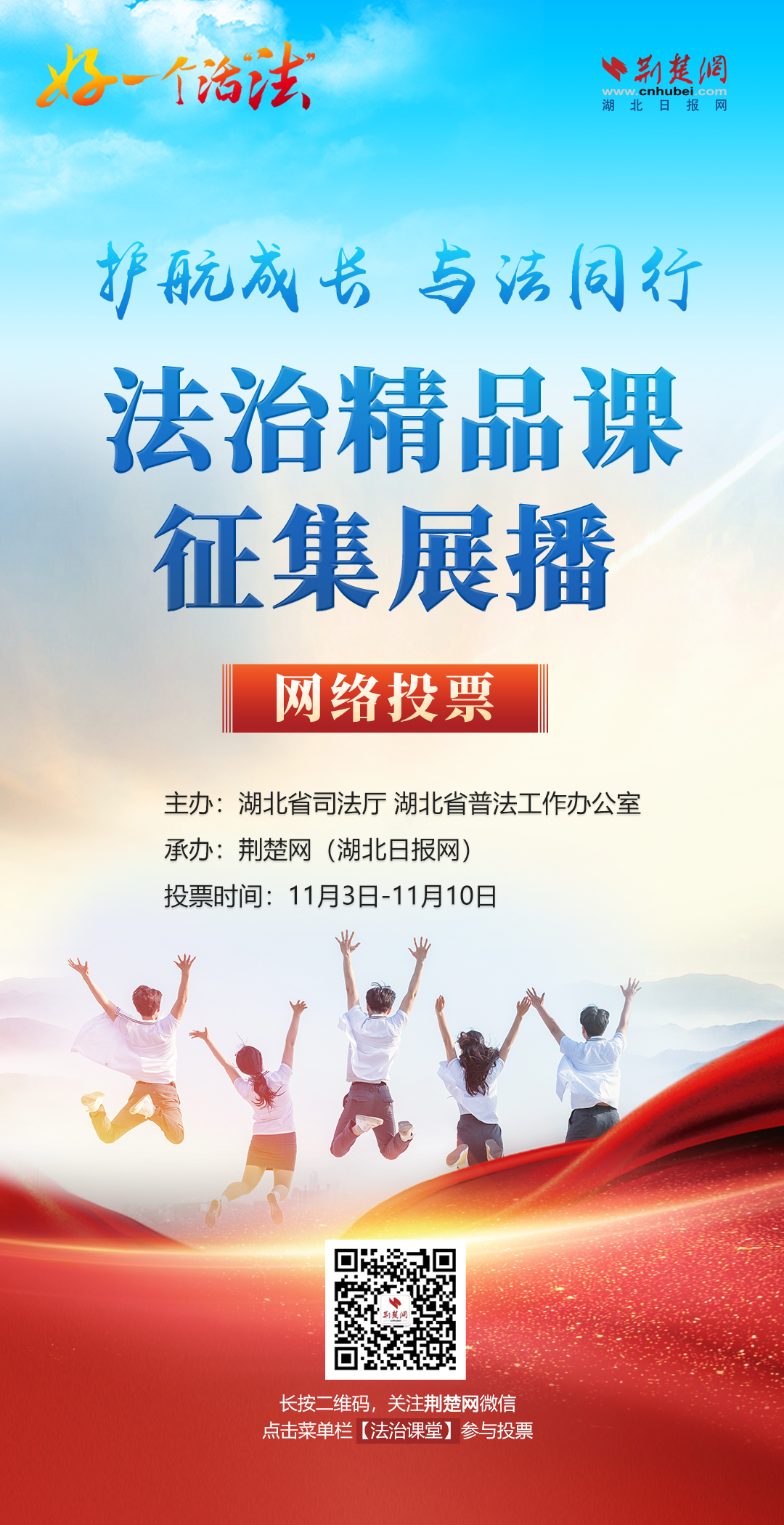 荆楚网(湖北日报网)讯(记者邱玲鹏 肖慧婷 实习生樊佳琦)法治精品课,护航少年的你。11月3日,由湖北省司法厅、湖北省普法工作办公室主办,荆楚网(湖北日报网)承办的“护航成长 与法同行”法治精品课征集展播活动正式开启网络投票。