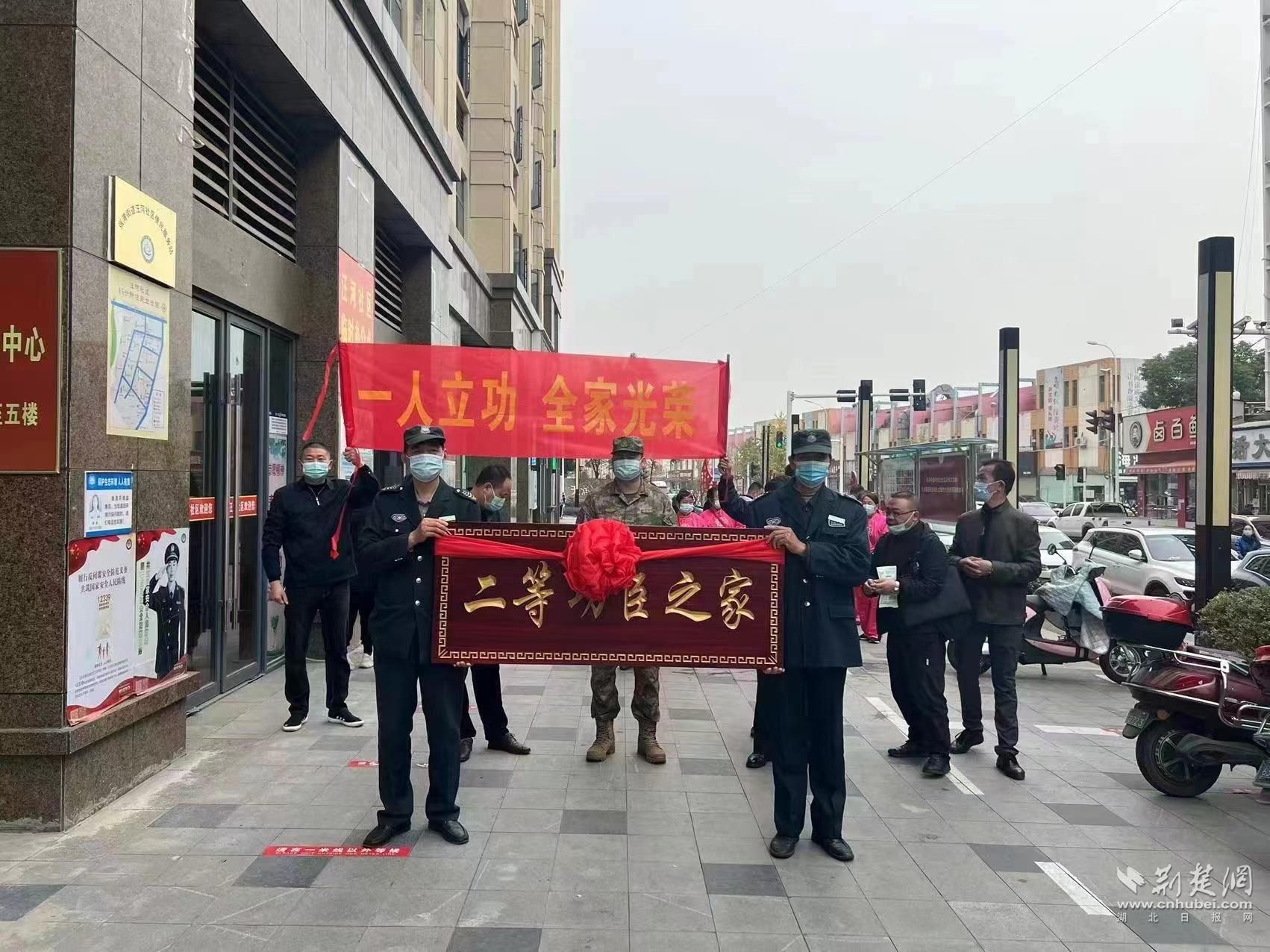 荆楚网(湖北日报网)讯(通讯员 李达军 李顺民)11月4日上午,襄阳市襄州区委常委、区武装部政委张峻峰及区退役军人事务局党组书记、局长李昌安一行敲锣打鼓,为荣立二等功的现役军人赵文龙的家属送上祝福和期盼,并颁发了“二等功臣之家”牌匾、喜报、奖金。