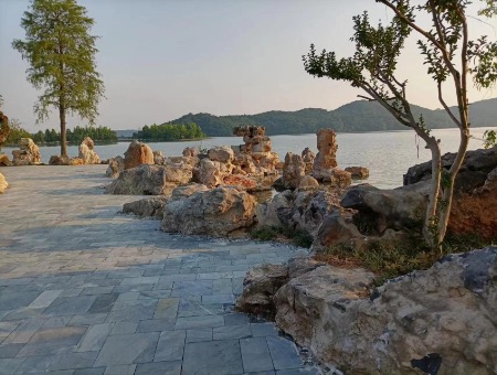 一次难得的机会,有人邀我赴岛一游,这个鲜为人知的景区吸引我把城市的喧嚣远远抛在脑后。经近一个小时的车程,宁静而偏僻的落雁岛映入眼帘。它南与磨山景区隔湖相望,北依白马景区。这里空气清新,风软波柔,有潋滟的碧光环绕的半岛,虽无车马人喧,但有呢喃的鸟语萦耳;无楼宇宽路,有松塔柏墙迎候;茵茵绿草有柔风轻拂,碧碧秋水无浪涛助威。半岛抱湖,湖拥半岛,湖岛简直如密不可分的恋人相拥相抱。抬眼望去,那是极为熟悉的磨山,一抹黛青耸立于碧波,识得磨山真面目,还真要隔湖相遥望哩!其秀美的曲线无不在倒影中叠现,就像对镜梳妆的古代仕女。