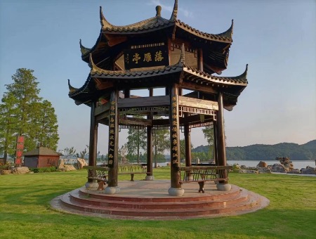 耸立在绿地中央的落雁亭,是座古色古香的仿古建筑,六根大红立柱支撑起了双重翘檐,正面立柱上镌有金色对联: