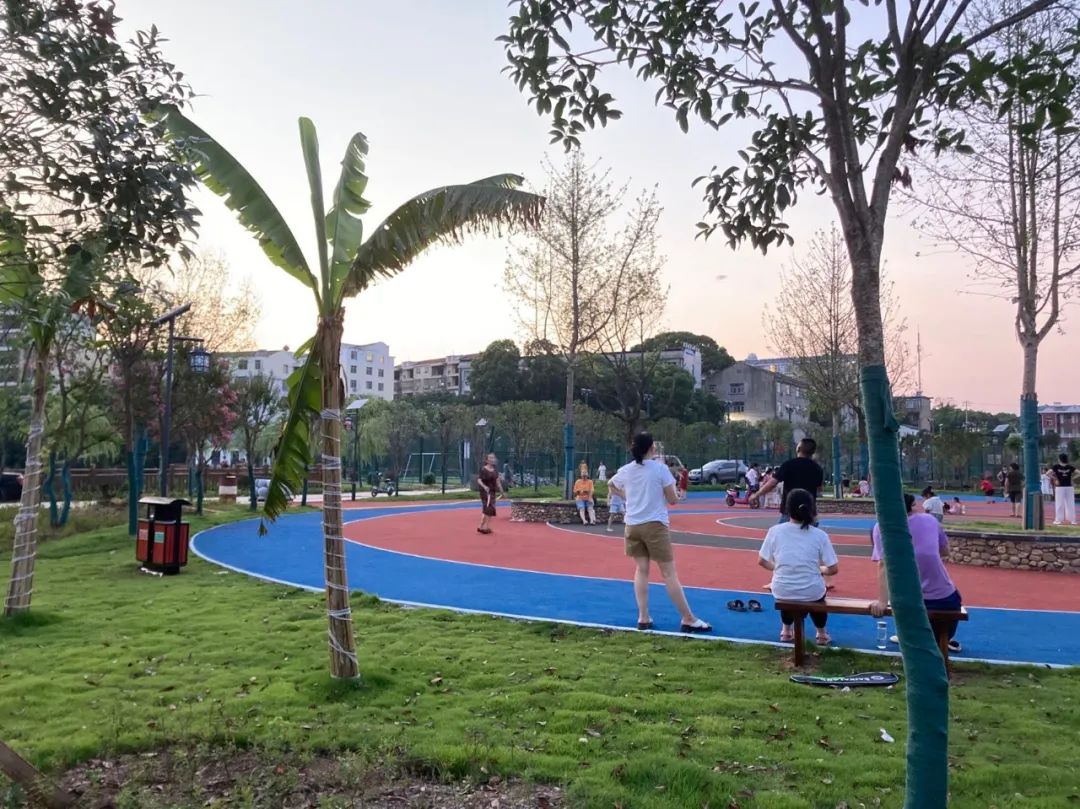 新龙湖文体广场背靠集镇区,怀抱新龙湖,紧邻王杨线。每到傍晚,华灯初上,湖水倒映着亭台栏杆、树木花草,广场上人影憧憧,练瑜伽、打篮球、跳广场舞……一派热闹祥和景象。