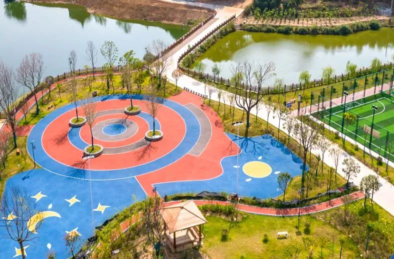 广场运动区建有占地面积4000平方米的三片连体笼式多功能运动场,提供羽毛球、足球、篮球、乒乓球多种运动专业场地,健身器材配套齐全。休闲区内树木高低错落有致,休闲步道蜿蜒曲折,亲水平台、休闲凉亭点缀其中。同时,在广场沿线打造景观节点2处,见缝插绿、见空建园,厚植“苗木茶叶之乡”绿色文化,与文体广场相映成趣。