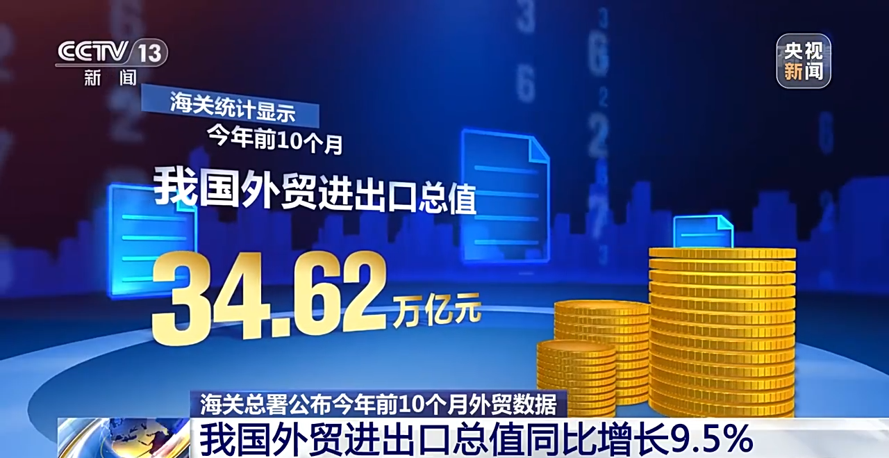 海关总署今天(7日)公布,今年前10个月,我国外贸进出口总值34.62万亿元,同比增长9.5%,外贸继续保持平稳运行。