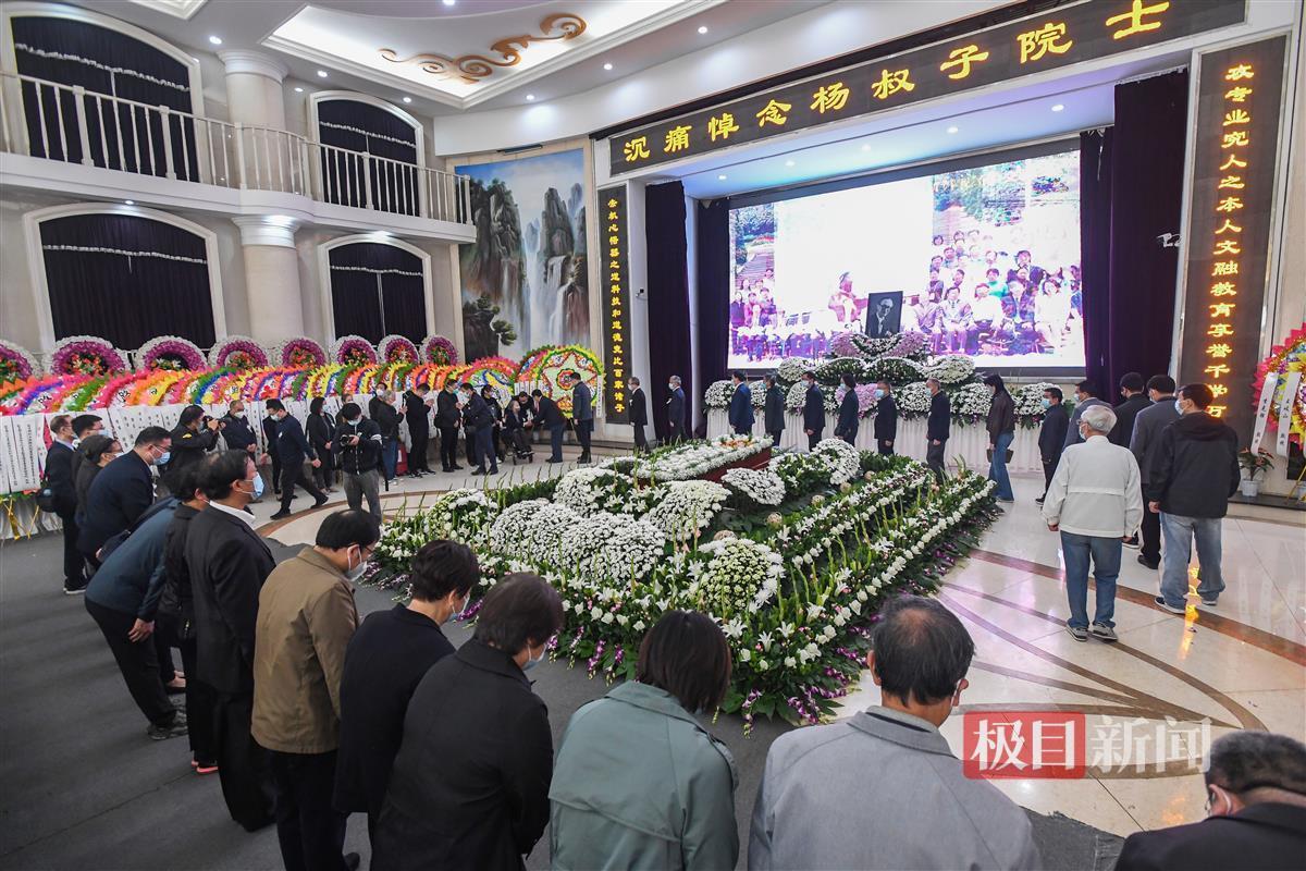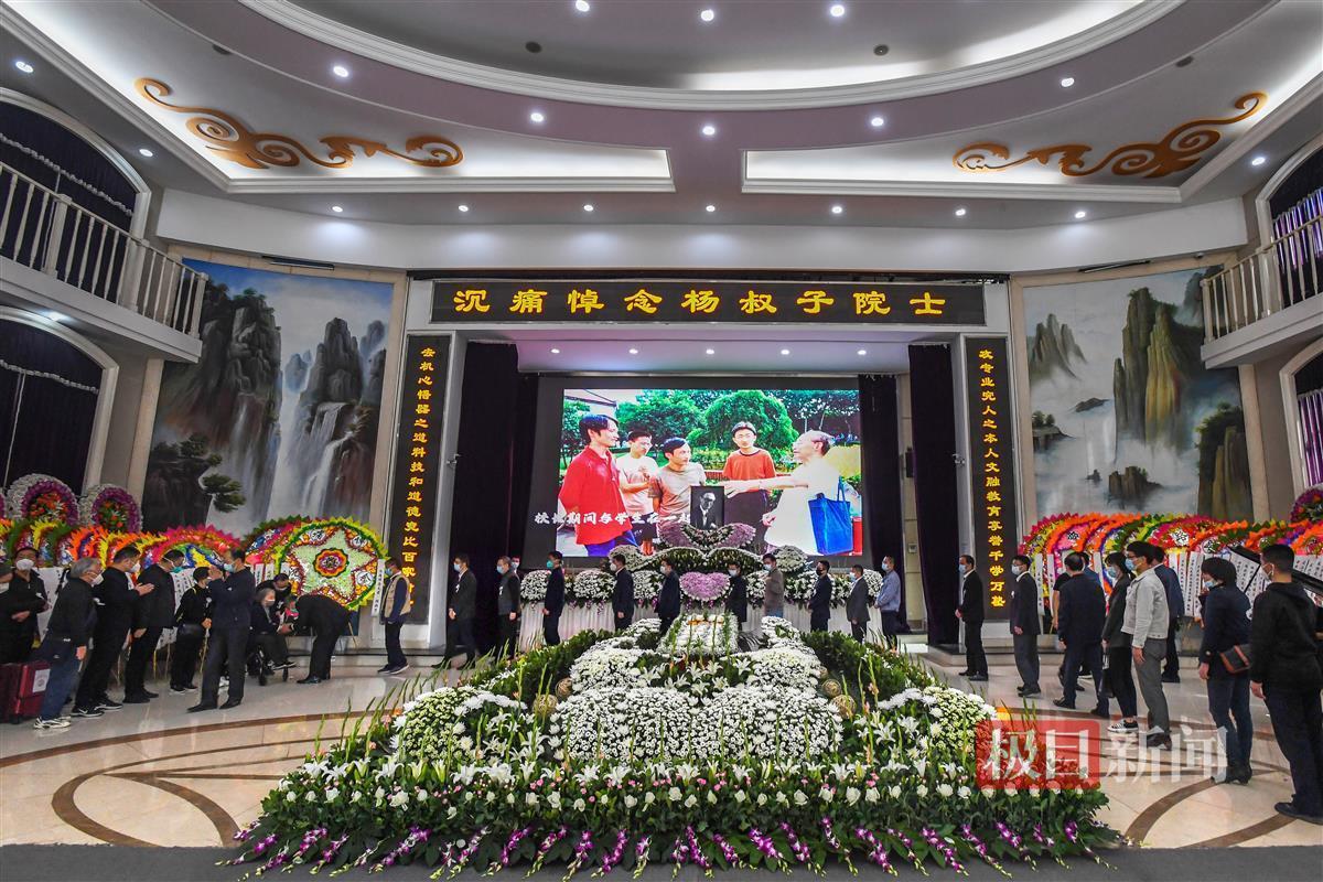 告别仪式现场,李培根院士题写的挽联“攻专业究人之本人文融教育享誉千学万塾 去机心悟器之道科技和道德竞比百家诸子”高悬两侧。数百名社会各界人士敬赠的花圈摆放灵堂两侧,以寄哀思。大厅中央屏幕上,播放着杨叔子院士生前工作、与学生和家人在一起的场景回顾。