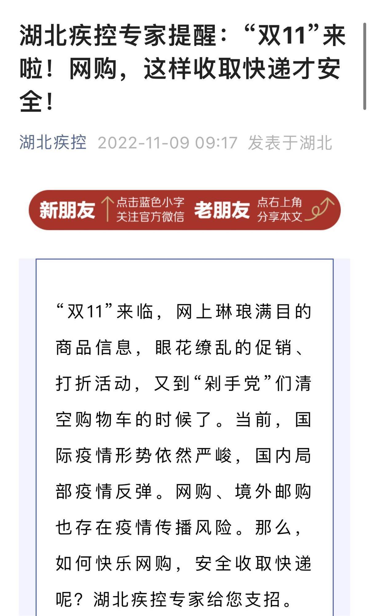 “双11”来临,网上琳琅满目的商品信息,眼花缭乱的促销、打折活动,又到“剁手党”们清空购物车的时候了。当前,国际疫情形势依然严峻,国内局部疫情反弹。网购、境外邮购也存在疫情传播风险。那么,如何快乐网购,安全收取快递呢?湖北疾控专家给您支招。