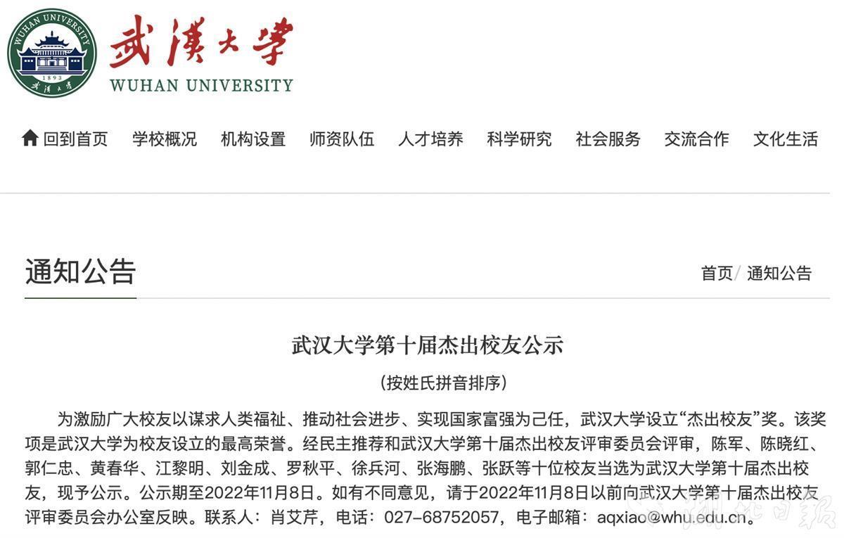 湖北日报讯(记者田佩雯)11月9日从武汉大学官网获悉,武汉大学第十届杰出校友日前结束公示。经民主推荐和评审委员会评审,陈军、陈晓红、郭仁忠、黄春华、江黎明、刘金成、罗秋平、徐兵河、张海鹏、张跃等十位校友(按姓氏拼音排序)当选为武汉大学第十届杰出校友。