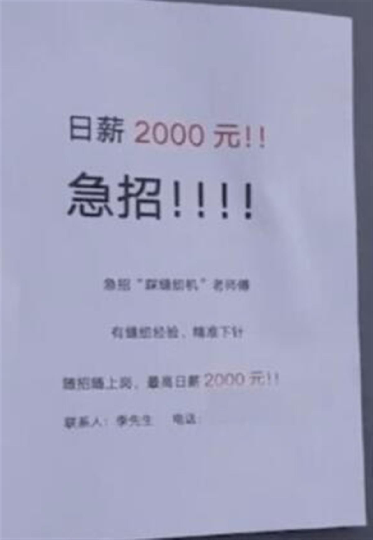 据媒体报道,11月7日,福建石狮一工厂开出最高日薪2000元招聘缝纫工。视频中一张纸上写着:“日薪2000元!急招‘踩缝纫机’老师傅,随招随上岗,最高日薪2000元!”