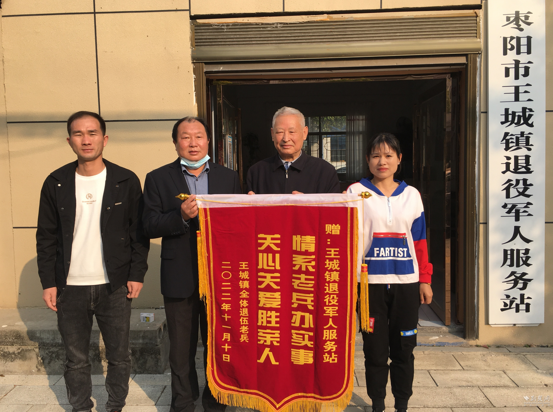 荆楚网(湖北日报网)讯(通讯员沈太艮)11月10日,家住重庆市的枣阳籍退役军人柯江南不远千里回乡,将镶印“情系老兵办实事 关心关爱胜亲人”的锦旗送到枣阳市王城镇退役军人服务站,感谢服务站工作人员对他多年的真情关怀。