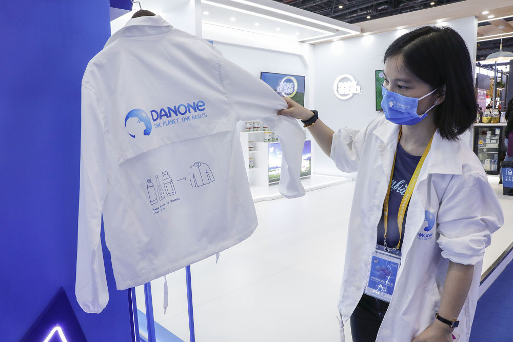在第四届中国国际进口博览会食品和农产品展区达能展台,工作人员展示用塑料饮料空瓶制造的外套(2021年11月6日摄)。新华社记者 张玉薇 摄