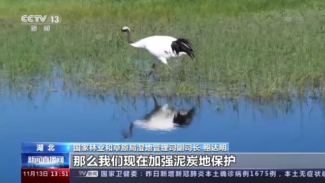 国家林业和草原局湿地管理司副司长 鲍达明:黑颈鹤是咱们中国唯一在高原上生活的鹤类,它就基本上生活在泥炭沼泽湿地上面。我只是举个例子,其实还有很多这样的鸟类、兽类等等,各种各样的生物都栖息在这个泥炭沼泽湿地里头。