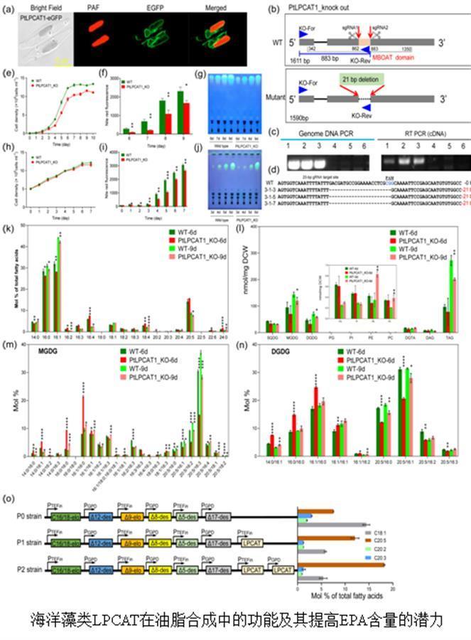 中国农科院油料所油料品质化学与加工利用团队经多年研究,在三角褐指藻中发现EPA高效合成的分子调控机制,发掘出调控EPA含量的关键基因LPCAT,并在产油酵母中采用合成生物学技术大幅度提高了EPA含量,破解了EPA生物合成中的代谢瓶颈问题。该研究主要完成人龚阳敏博士介绍,LPCAT基因如同一个开关,如果把它敲除,三角褐指藻体内甘油三酯含量马上降低,总脂肪酸中EPA含量迅速减少;而在产油酵母中把它加强,EPA含量则很快提高,而且拷贝数越多,EPA含量也增加越多。