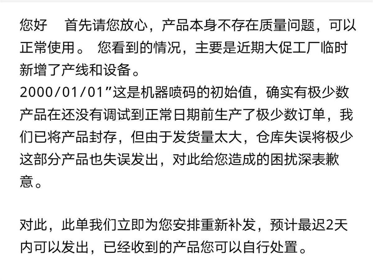 极目新闻记者私信陈女士购买卷纸的商家客服,工作人员表示,他们不售卖过期产品,卷纸本身不存在问题,可以正常使用,是仓库喷码喷错了。近期,工厂临时新增了设备,“2000/01/01”的生产日期是机器喷码的初始值,确实有极少数产品在没有调试到正常日期前生产了少数订单,但已经将产品封存,陈女士的订单是仓库发货失误造成,已经安排重新补发。