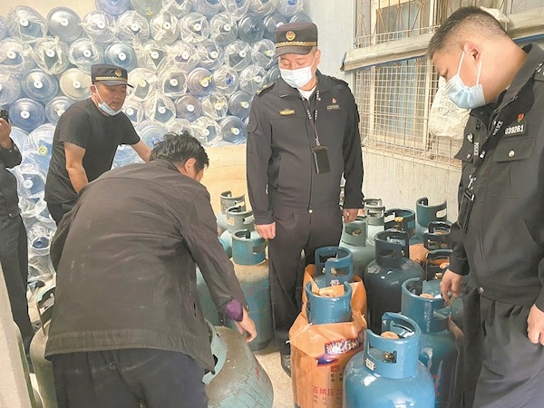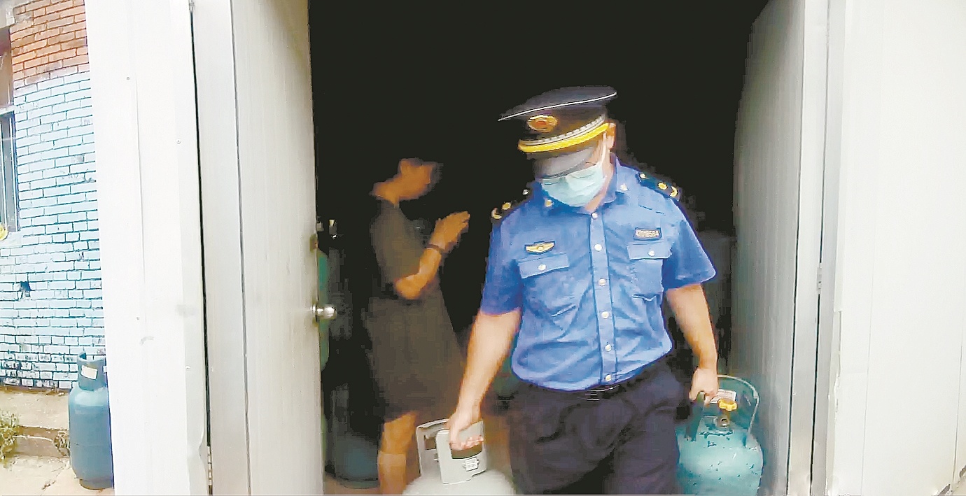 东西湖将军路街城管队员暂扣黑气点液化气瓶 通讯员供图