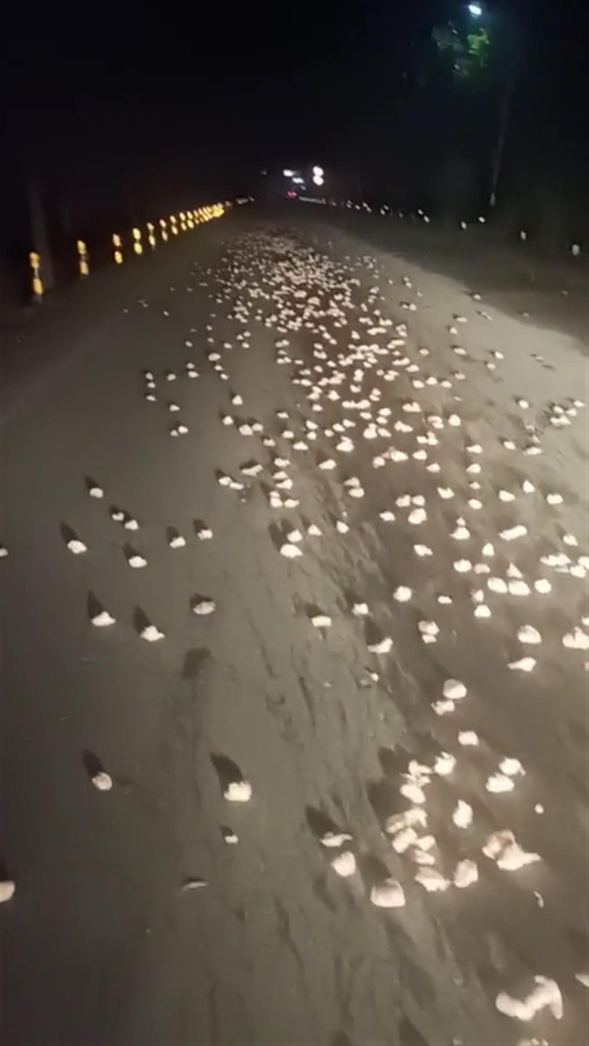 孔先生拍摄的视频显示,路面上密密麻麻散落的全是鸡屁股,车前车后,灯光照射的范围内,全是遗落的鸡屁股。