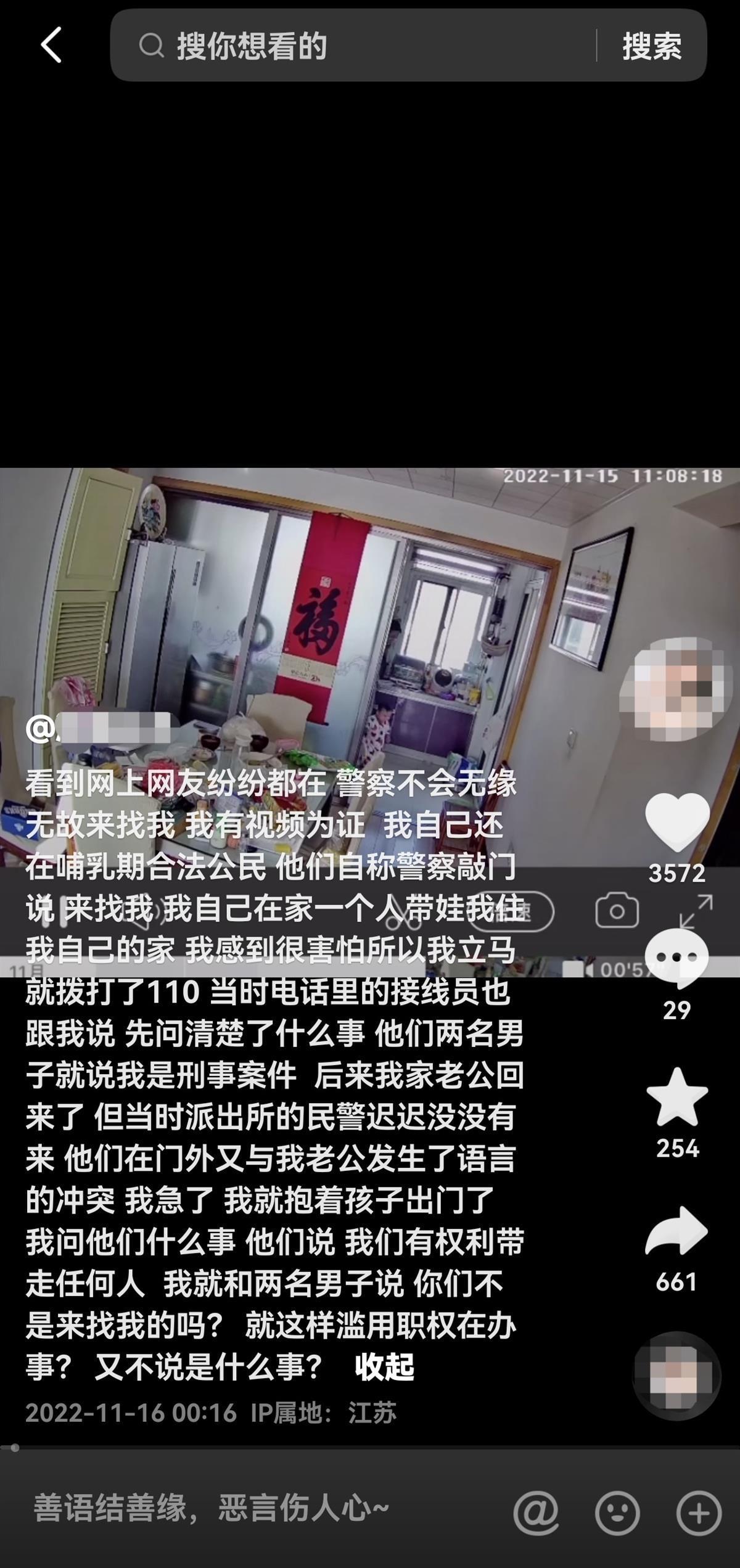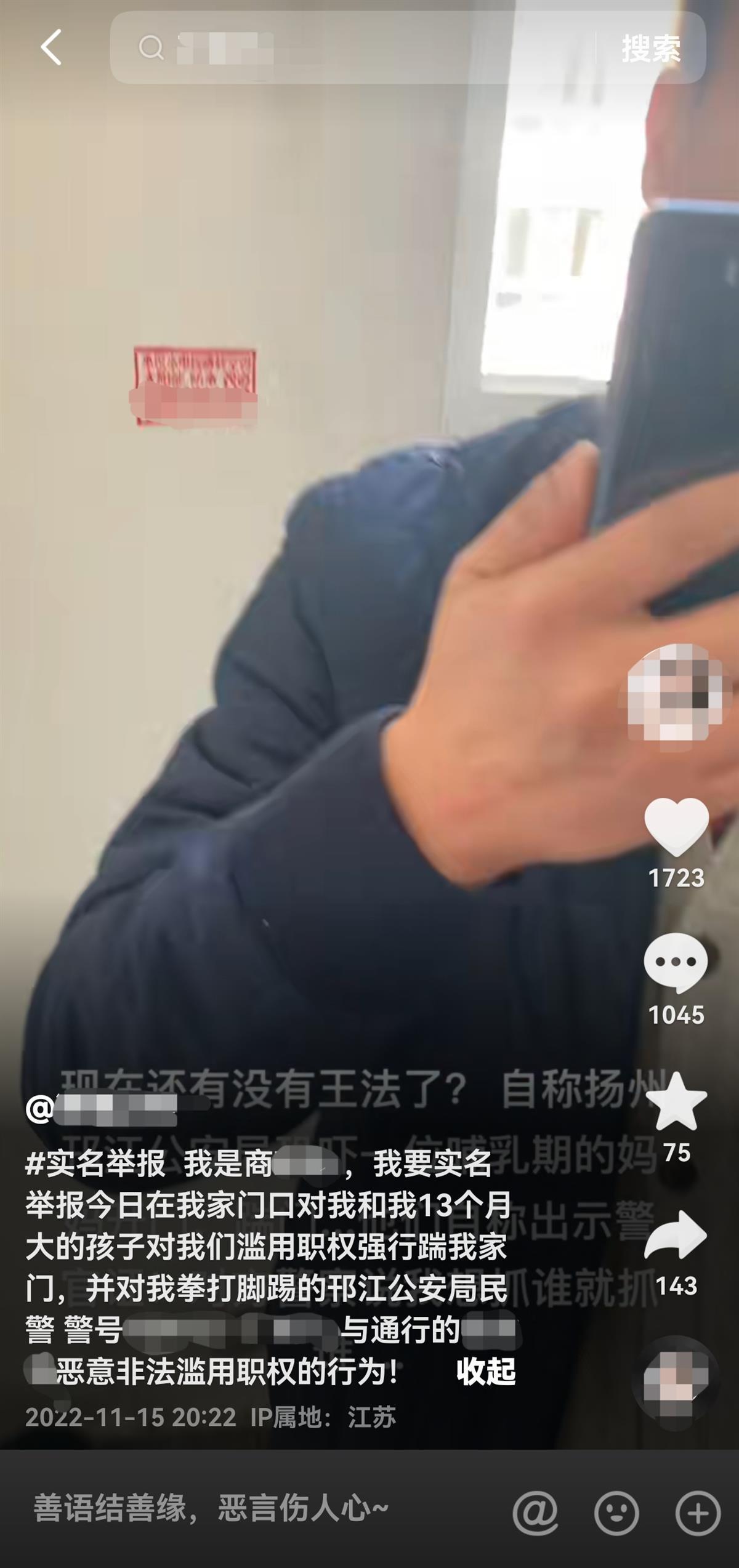 11月15日晚至16日凌晨,江苏扬州的商女士发视频实名举报称,扬州市邗江区公安分局两名民警滥用职权。商女士称,民警到她家上门调查时穿着便装敲门,她一个人带娃在家有些害怕,便没有开门,并拨打了110求助。随后她丈夫回家,在门外与两名民警发生了言语冲突。商女士还称,两名民警强行踹了她家门,把她家的指纹锁弄坏了。