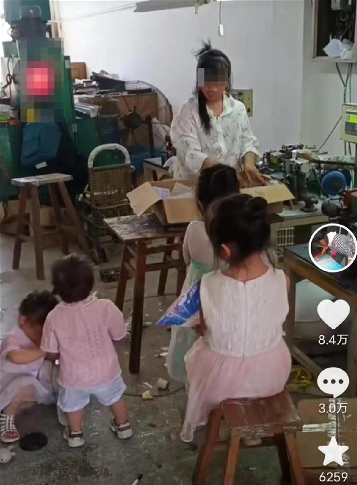 胡女士发布的视频中,她将孩子们带到自己工作的车间照顾