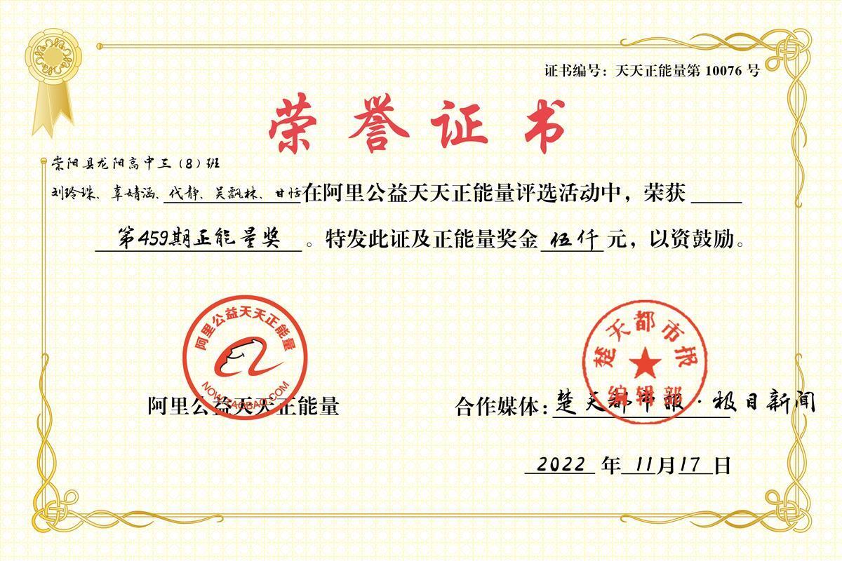 一段视频温暖一座城,11月17日,5位学生也因此荣获第459期阿里公益天天正能量奖。颁奖词中这样写道:扶救,陪伴,声声呼唤……课堂上,她们是讲台下的学子,那一刻,她们是全社会的榜样。孩子们的赤子之心当赞,背后家风校风亦值得点赞,有少年如此,社会之幸!